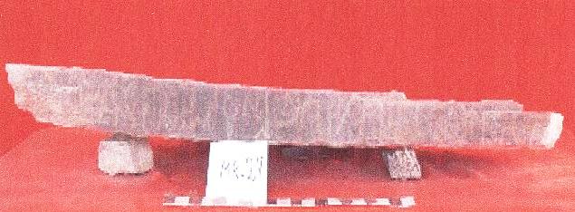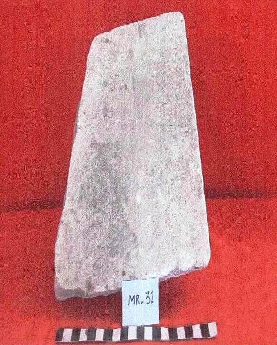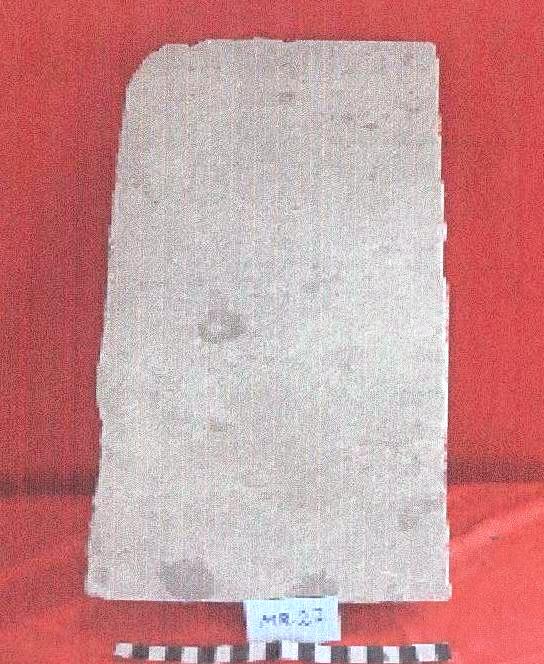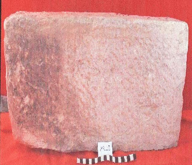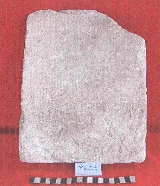 قطعه من الحجر الجيري مستطيلة الشكل عباره عن بلاطه واجهتها الاماميه مصقوله ,بها تكسر مفقود في احد الاركان .