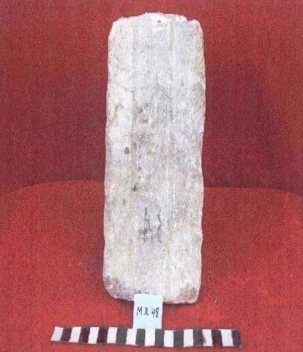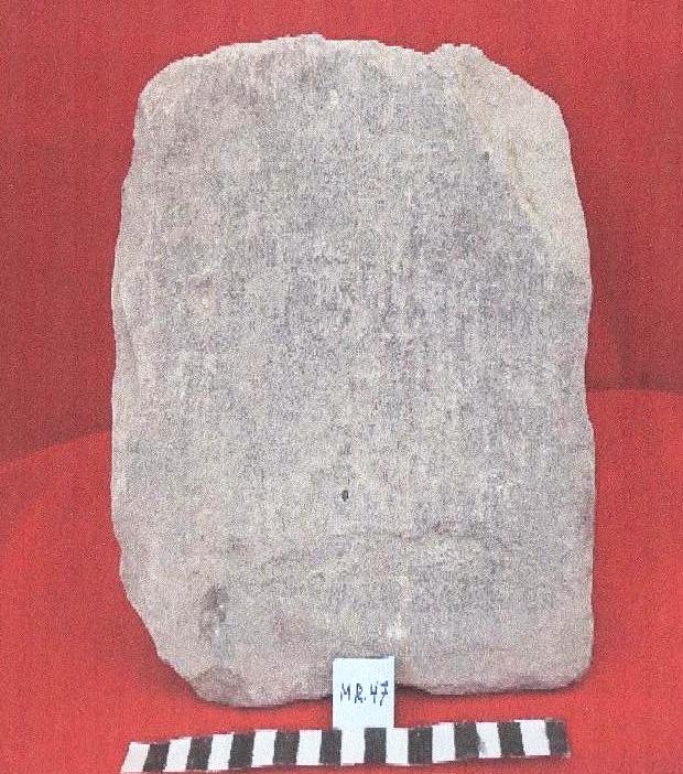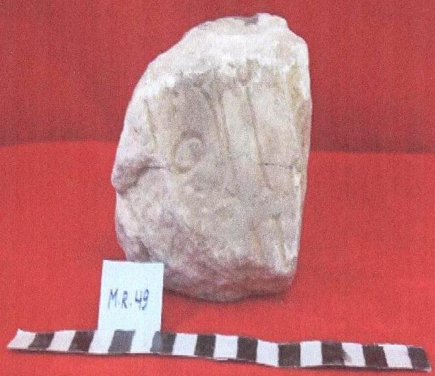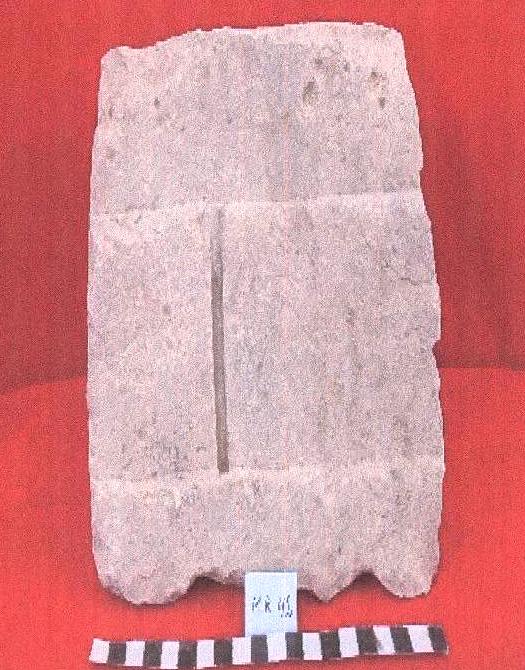 قطعه من الحجر الجيري الكلسي مستطيلة الشكل على واجهته الامامية نقش مكون من سطر واحد مكسور من الجانبين ومفقود نصه