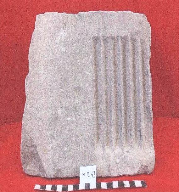 قطعه من الحجر الجيري مستطيلة الشكل عباره عن عنصر معماري واجهته الاماميه على الطرف مزخرفة بقنوات راسيه وبجانبها منطقة مصقوله خلفيتها غير مهذبه