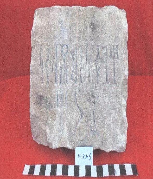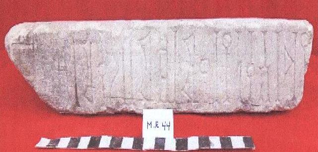 قطعه من الحجر الجيري مستطيلة الشكل واجهتها مصقوله وعلى واجهتها نقش مكون من ثلاثة اسطر القطعه مكسره من جميع الجوانب