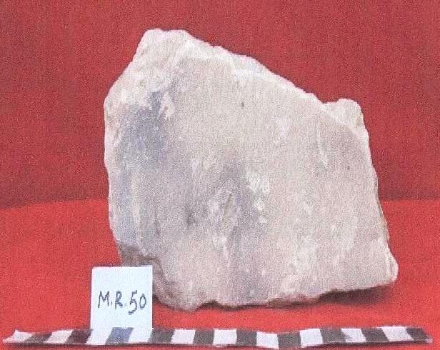 قطعه من حجر الرخام غير منتظمة الشكل مكسره من جميع الجوانب ومفقوده على احد الاوجه بقايا ثلاثه حروف