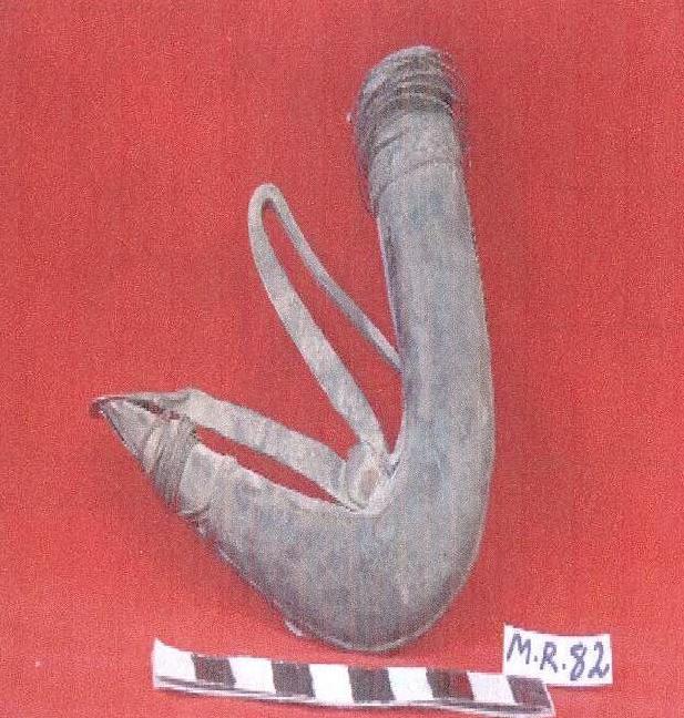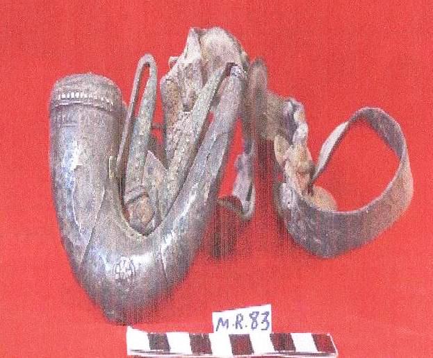 قطعه من النحاس عباره عن مذخرة بارود مثلثة الشكل احد الاطراف مدبب والطرف الاخر مستدير مثبت في وسطها من الداخل قطعه اخرى مثلثه احد طرفيها ينتهي بالطرف المدبب,للمذخره حزام من الجلد مثبت مثبت به وبها قطع معدنيه مختلفه .