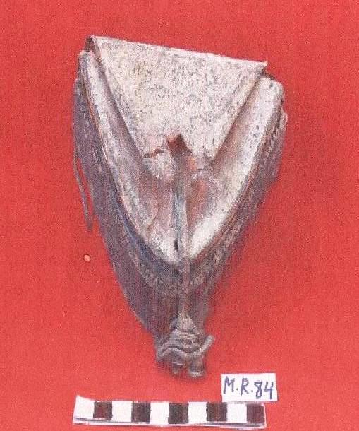 قطعه من الخشب عباره عن محفظه مثلثة الشكل لها غطاء مثلث القطعه مغطاه بالجلد وصفائح معدنيه ومطعمه بفصوص من العقيق ,مثبت على المحفظه حزام من الجلد .