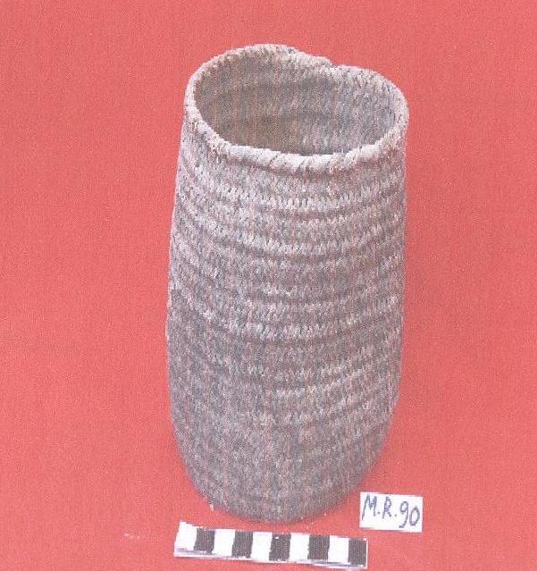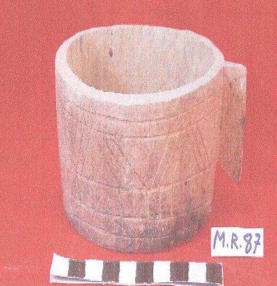 قطعه من الخشب عباره عن انيه اسطوانية الشكل لها فوهه واسعه ,على البدن زخرفه هندسيه مختلفه ,للانيه قاعده مسطحه من نفس البدن ومقبض وبها شرخ يمتد من الحافه وحتى القاعده .