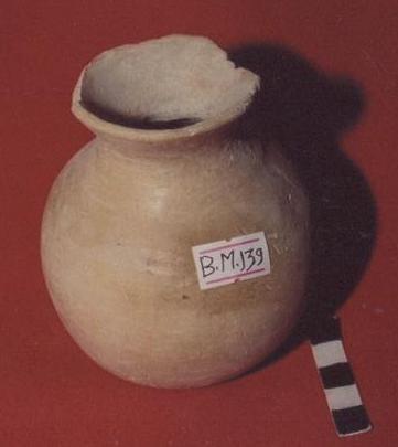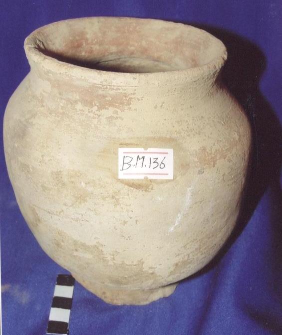 قطعه من الفخار عباره عن انيه كروية الشكل بدنها يضيق من الاسفل ويتسع قليلاً في الاعلى ،حافتها دائريه تبرز قليلاً الى الخارج ،يرتكز البدن على قاعده دائريه عليها شطوف،البدن خالي من الزخارف عليه شرخ بسيط من اعلى الحافه حتى اسفل البدن .