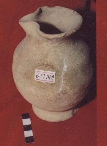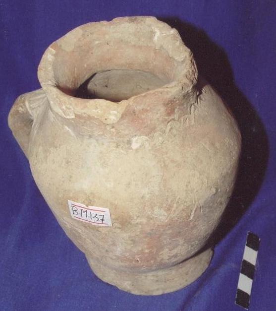 قطعه من الفخار عباره عن انيه كروية الشكل بدنها يضيق من الاسفل ويتسع قليلاً في الاعلى ،حافتها دائريه تبرز قليلاً الى الخارج عليها شطوف ،يرتكز البدن على قاعده دائريه عليها كسر مفقود ، على البدن مقبض مفرغ به ثقب نافذ مشطوف جزء منه ، اسفل الحافه زخرفه مموجه غائره ،على البدن شطوف خفيفه .