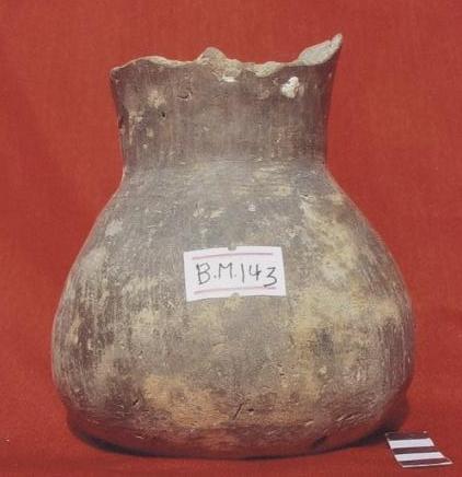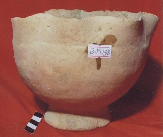قطعه من الفخار عباره عن انيه كروية الشكل حافتها دائريه متموجه عند احد الجوانب ، يرتكز البدن على قاعدة دائريه عليها كسور ومفقوده البدن خالي من الزخارف عليه ندوب طفيفه