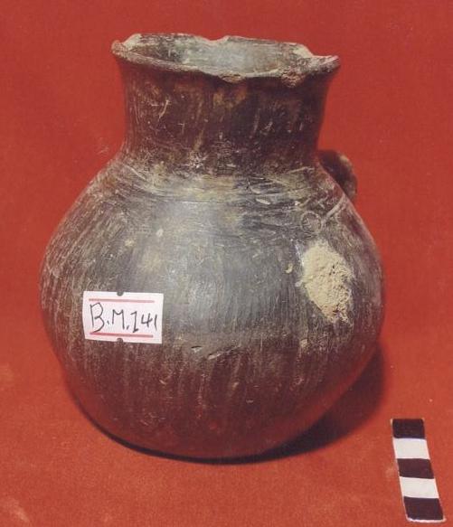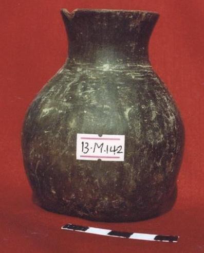 قطعه من الفخار المحروق سوداء اللون عباره عن انيه كروية الشكل لها عنق اسطواني ينتهي بحافه دائريه تبرز قليلاً الى الخارج عليها شطوف خفيفه ، لها قاعده مسطحه من نفس البدن ، البدن خالي من الزخارف له مقبض مفرغ من اسفل العنق حتى منتصف البدن .