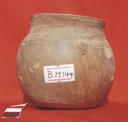 قطعة من الفخار المحروق بنية اللون عبارة عن انية كروية الشكل ،حافنها دائرية تبرز قليلاً الى الخارج ،البدن خالي من الزخارف علية شروخ وشطوف بسيطة،اعلى البدن ثلاث بروزات لة قاعدة مسطحة من نفس البدن .