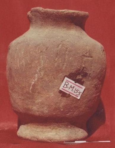 قطعه من الفخار عباره عن انيه ذات بدن مستدير لها كتف في اعلى البدن تنتهي بحافه تبرز الى الخارج يرتكز البدن على قاعده مستديره شبه مقعره ،اعلى البدن كتابه بالخط المسند نصها :