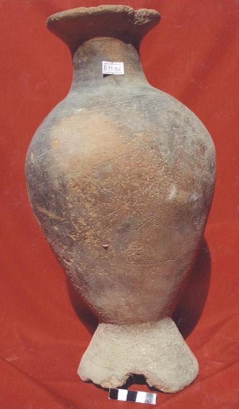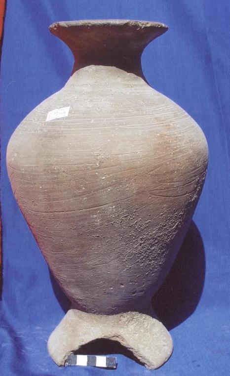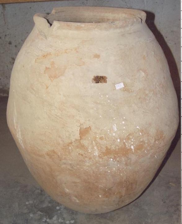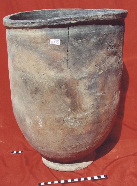 قطعه من الفخار عباره عن انيه كبيرة الحجم اسطوانية الشكل (دوح)حافتها دائريه بدنها يضيق قليلاً من الاسفل ويتسع تدريجياً الى الاعلى ،على البدن اربعه شروخ من اعلى الحافه حتى منتصف البدن تنهي بقاعده دائرية الشكل عليها شطوف ،البدن خالي من الزخارف تعرض للحرق حتى ادى الى تكوين طبقه سوداء اللون وقشور كبيره .