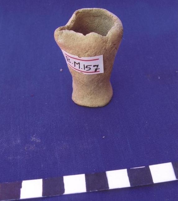 قطعه من الفخار صغيرة الحجم عباره عن انيه تشبه الكاس قاعدتها مستديره مفرغه، البدن خالي من الزخارف .