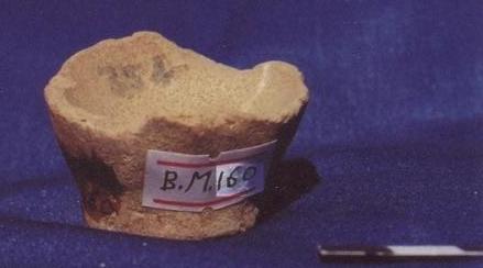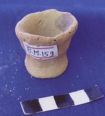قطعه من الفخار صغيرة الحجم عباره عن انيه مخروطية الشكل حافتها تبرز قليلاً الى الداخل ،واجهتها بارزه مضغوطه قليلاً قاعدتها مستديره مقعره البدن خالي من الزخارف .
