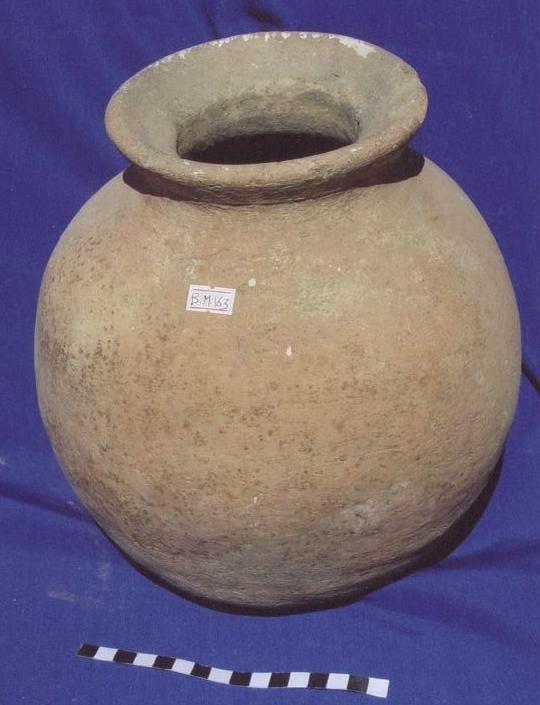قطعه من الفخار عباره عن انيه كروية الشكل بدنها خالي من الزخارف عليه ندوب طفيفه ،حافتها دائرية الشكل تبرز قليلاًس الى الخارج عليها بعض الشطوف ،قاعدتها مسطحه من نفس البدن .