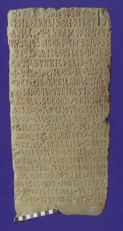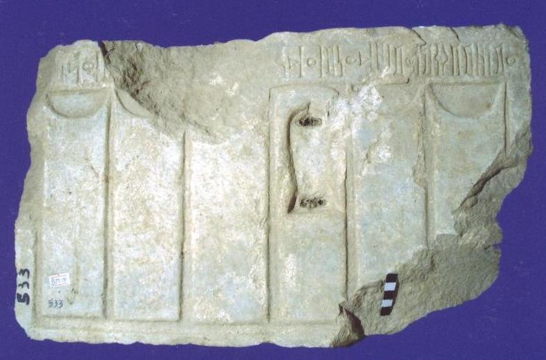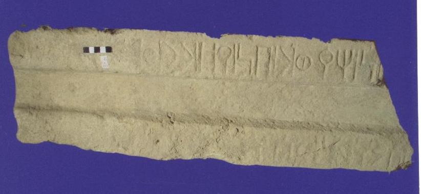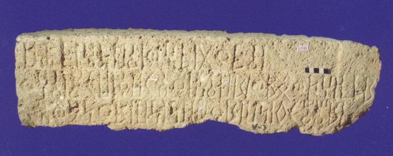 قطعة من الحجر الكلس شكلها يشبه المثلث سطحها عليه تقشير ,واجهة القطعة عليها نقش مكون من سطرين