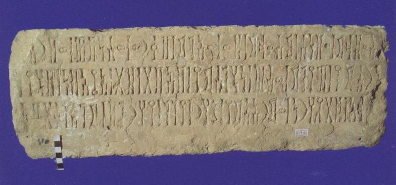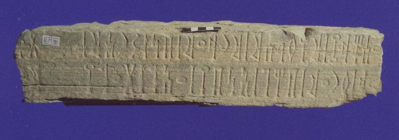النقش حروف اغلبه غير واضحه وعليها ندوب وربما يكون النقش جزء من عنصر معماري
