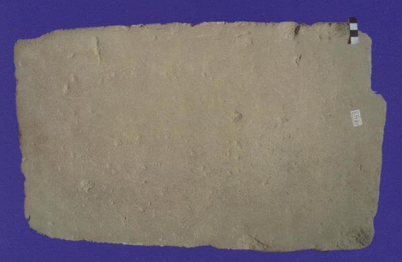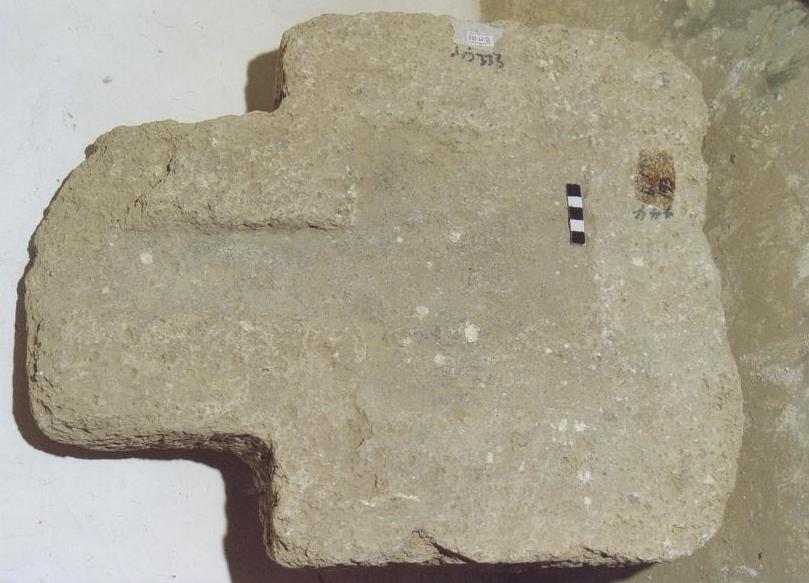 قطعه من الحجر الجيري مسستطيلة الشكل عبارة عن ميزات أعلا القطعه قناة عريضة محفور عرض القناة 95 سم سطح القناة عليها سطر بالمسند من احد الجهات نص