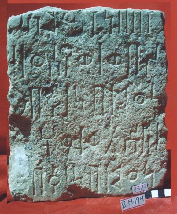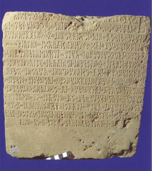 النقش مكتوب بخط المحراث على القطعة كسر مفقود ,اسفل الجانب الايمن وخلفيتها غير مهذبة