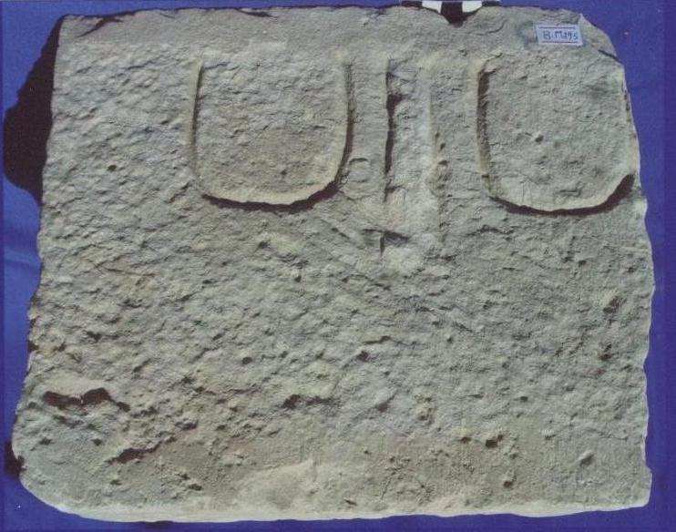 قطعة من الحجر الجيري بيضاء اللون شبه مربعة ,ربما تكون شاهد قبر على واجهتها نحت غائر للعينين بشكل حذوة الفرس والانف بشكل بارز وخلفيتها غير منتظمة