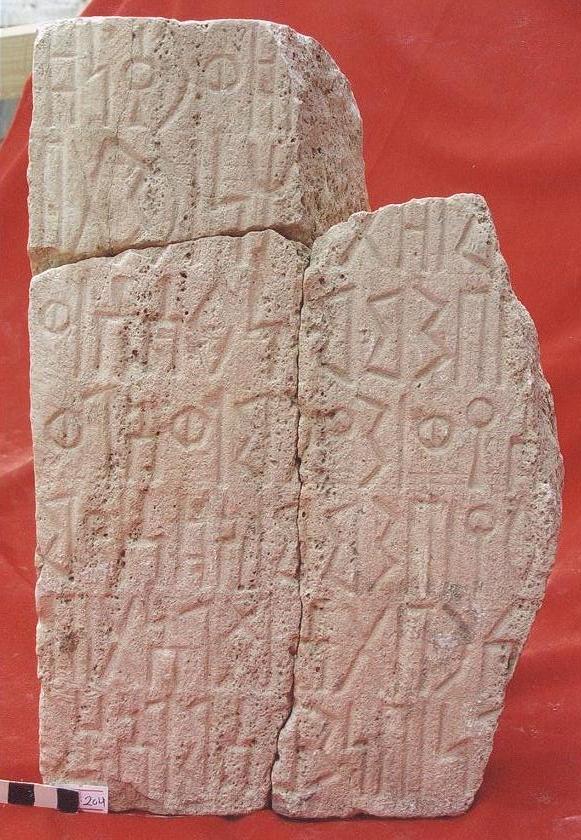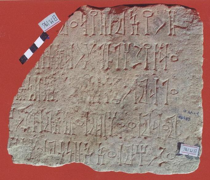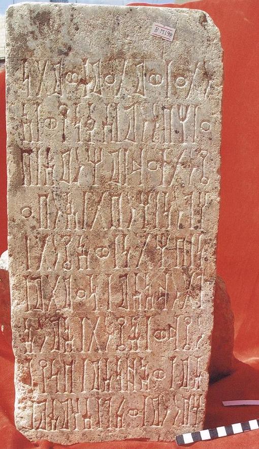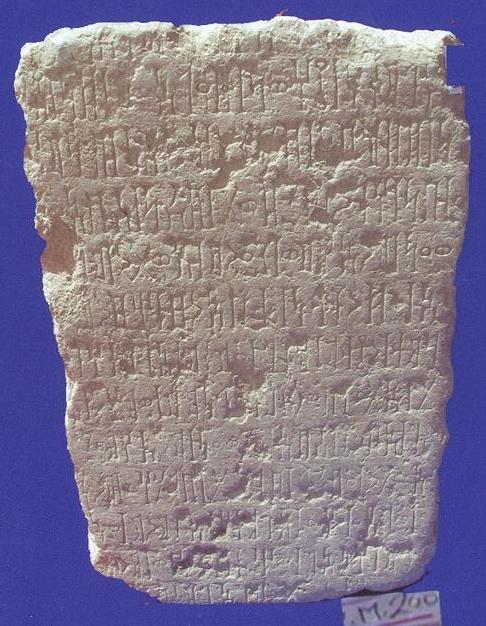 قطعة من حجر البلق بيضاء اللون مستطيلة الشكل عبارة عن نقش على واجهتها كتابة بالمسند بالخط الغائر مكون من تسعة اسطر نصها