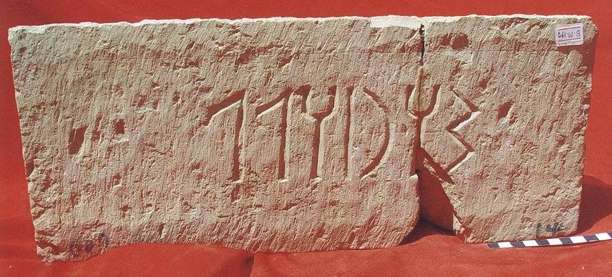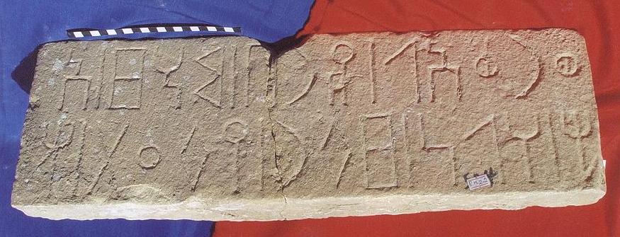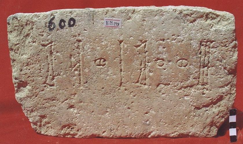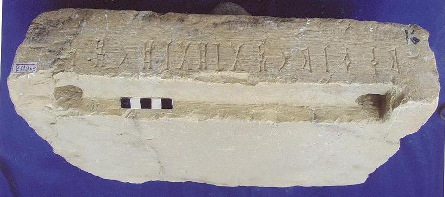 قطعة من الحجر الجيري بيضاء اللون مستطيلة الشكل, مكسورة الى جزئين واعيد ترميمها على الكتابة نقش مكون من سطر واحد