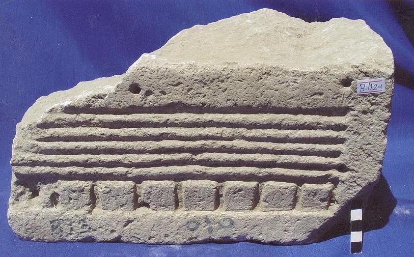 قطعة من الحجر الجيري بيضاء اللون عبارة عن جزء من لوحة شبة مستطيلة على واجهتين زخرفة هندسية عبارة عن خطوط بارزة يعلوها مربعات بارزة ,على اللوحة خمسة ثقوب ,القطعة مكسورة من احد الجوانب ومن الاسفل ومفقود ,وربما كان الجزء المفقود من القطعة يمثل لوحة كاملة عليها نقش