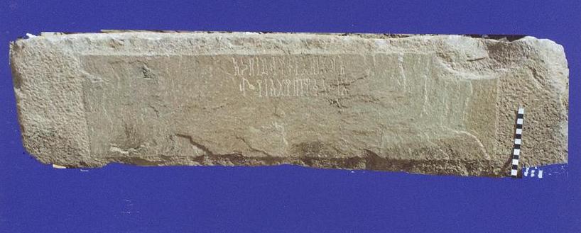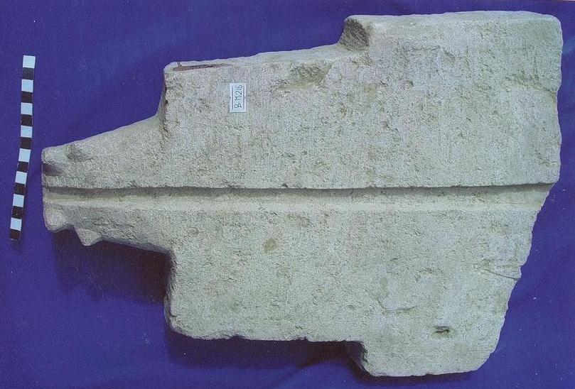 قطعة كبيرة الحجم عبارة عن نقش مكون من خمسة اسطر غير واضحة في السطر الاول والثاني والثالث والرابع والخامس تقرا منها التالي :