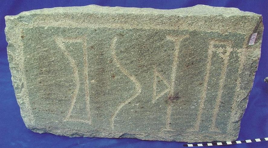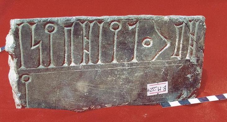 قطعة مستطيلة الشكل سوداء اللون على واجهتها نقش بالمسند مكون من اربعة احرف بالنحت الغائر نصه :