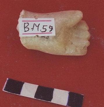قطعه من العاج بيضاء اللون مستطيلة الشكل (تميمه) مكسره الى عدة اكسار واعيد ترميمها ،على واجهتها زخرفه موطره وفي الوسط رسوم حيوانيه وادميه ،وفي احدى الاطراف بروز به ثقب نافذ .
