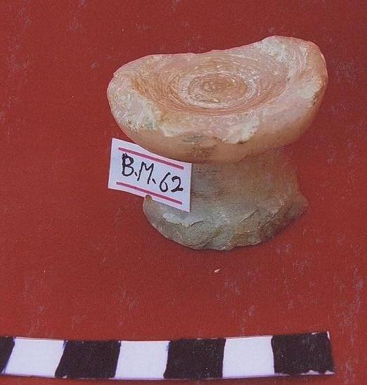 قطعه من الرخام بيضاء اللون عباره عن كاس مكسور الجزء الاعلى منه ومفقود ،يرتكز على قاعده دائريه مفرغه ،اسفل القاعده شطوف .