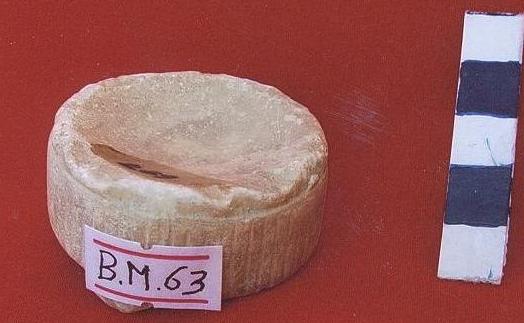 قطعه من الرخام بيضاء اللون عباره عن انيه دائرية الشكل مكسور جزء منها ومفقود ،بدنها خالي من الزخارف ،حافتها دائريه ،لايوجد لها قاعده .