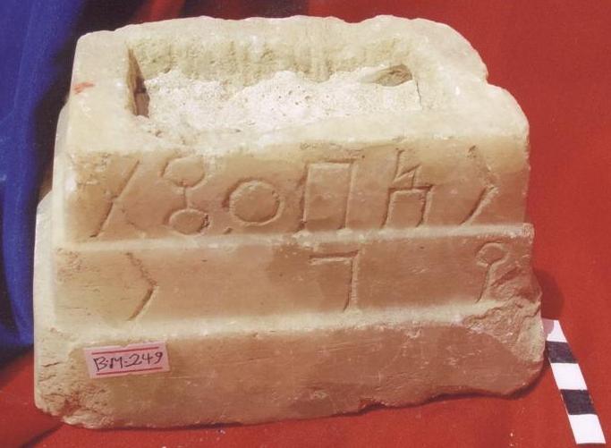 سطح القاعدة عليها حفر غائر مستطيل علية بقايا جصية .