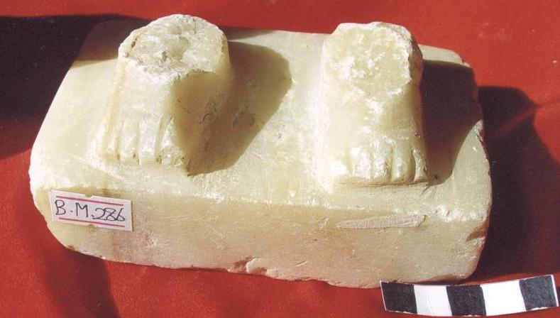 قطعة من حجر الرخام عبارة قاعدة لتمثال ادمي ذات اربعة اوجه جميع الجهات مصقولة .سطح القاعدة عليها بقايا اقدام