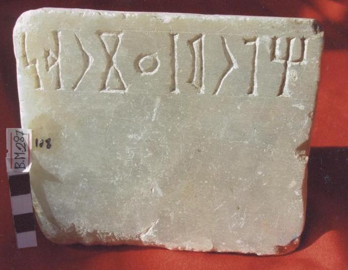 قطعة من حجر الرخام عبارة عن قاعدة واجهتها مصقولة على الواجهه من الاعلى سطر بالخط المسند نصه..................