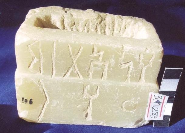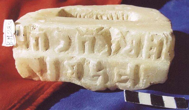 قطعة من حجر الرخام مربعة الشكل تقريباً ذات اربعة اوجة ,الجوانب والامام واحد الجوانب عليها كتابة بالمسند نصها .......