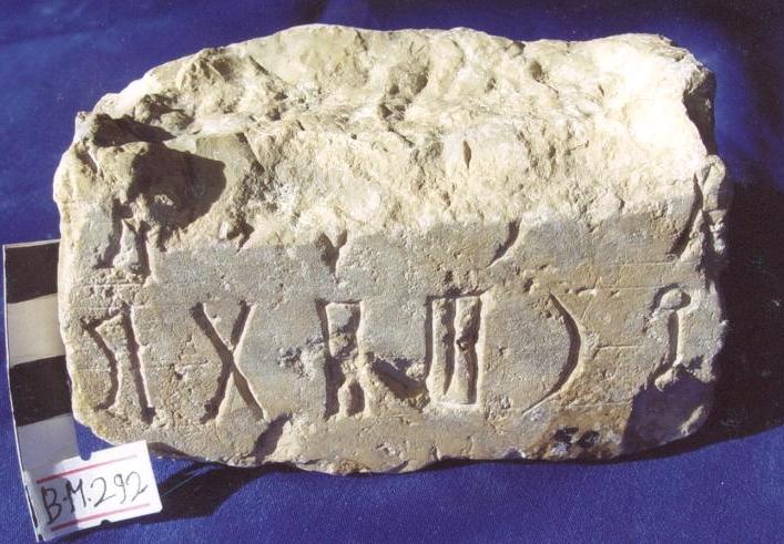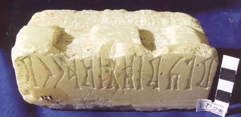 قطعة من الحجر الجيري عبارة عن قاعدة مدرجة من الامام ,الجوانب والامام مصقولة ,الخلفية غير مصقولة ,على الواجهة سطرين بالمسند نصة ......................