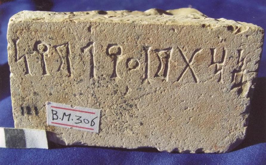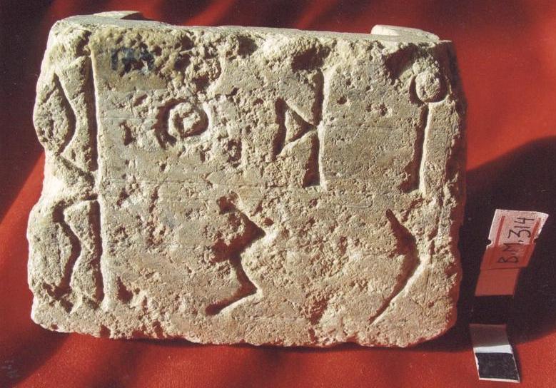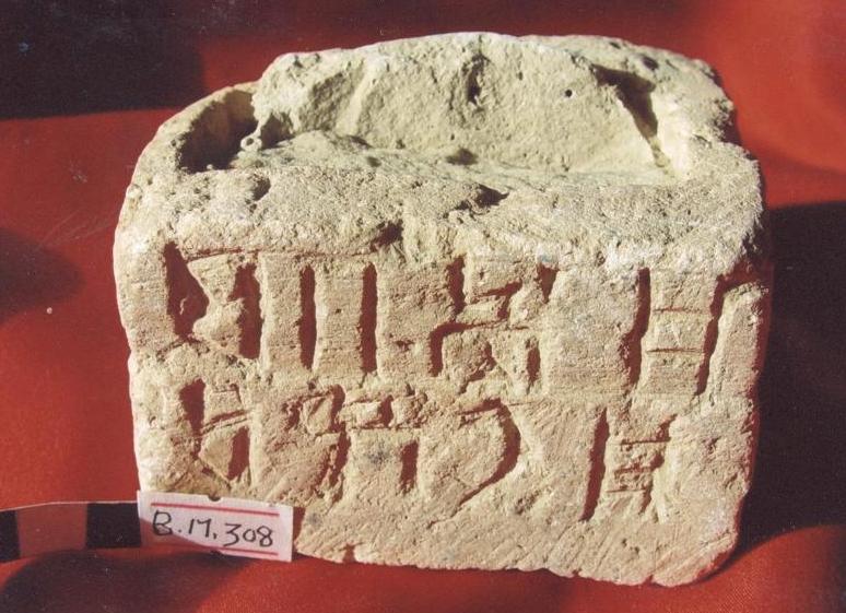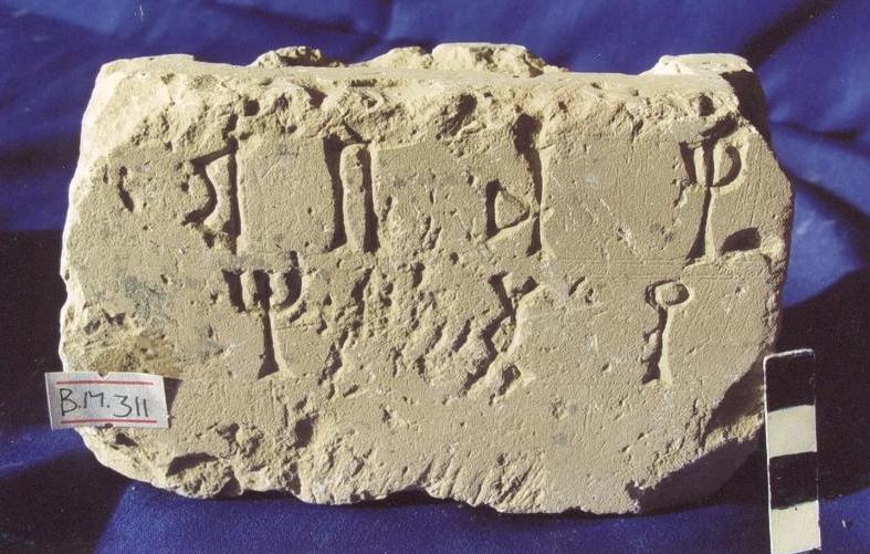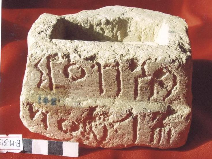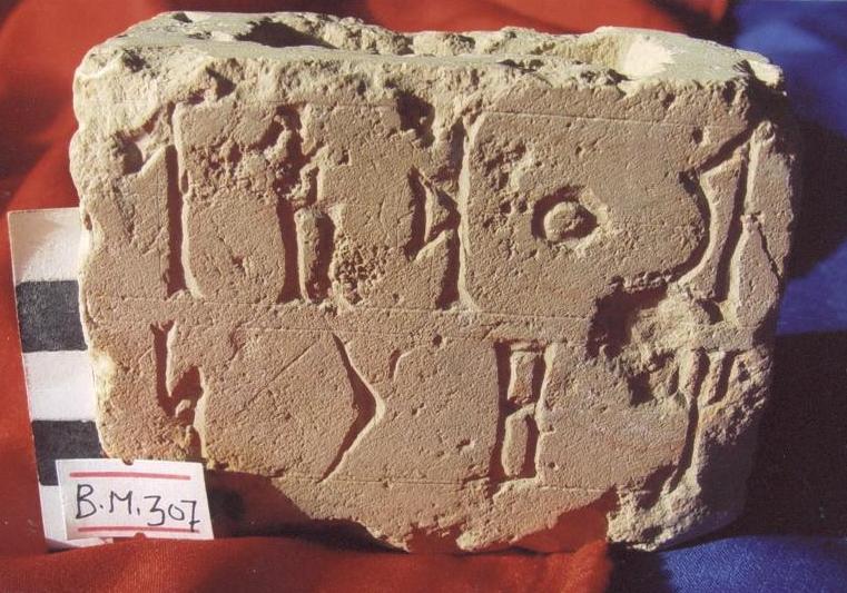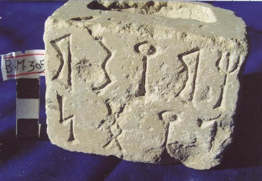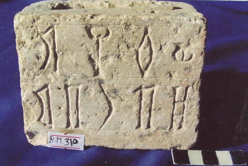 قطعة من الحجر الجيري عبارة عن قاعدة ذات اربعة اوجه ,الواجهة والجوانب مصقولة والخلفية غير مهذبة ,على الواجهة سطرين نصها :.