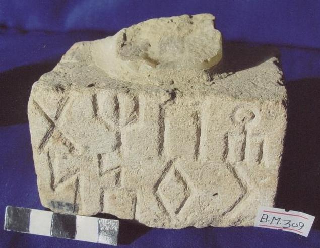 سطح القاعدة عليها حفر غائر عليه بقايا جصية معدل طول الحرف 2,5سم