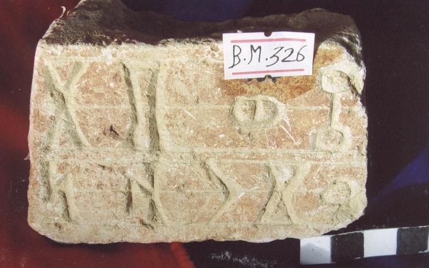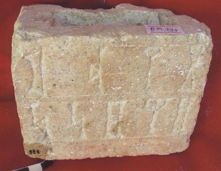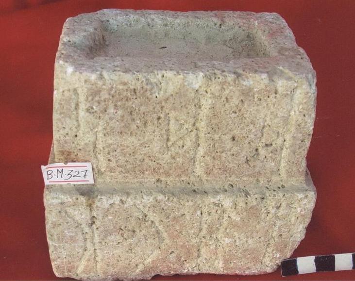 سطح القاعدة عليه حفر بداخلة بقايا جصية ارتفاع الحرف 3*5سم
