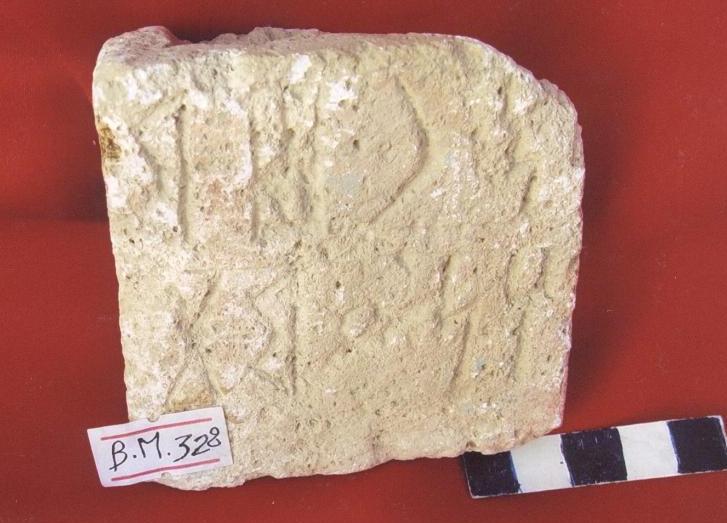 قطعة من الحجر الجيري بيضاء اللون تمثل قاعدة شاهد واجهتها مكسورة من الاعلى ومفقود على واجهتها نقش بالمسند الغائر مكون من سطرين نصها ..