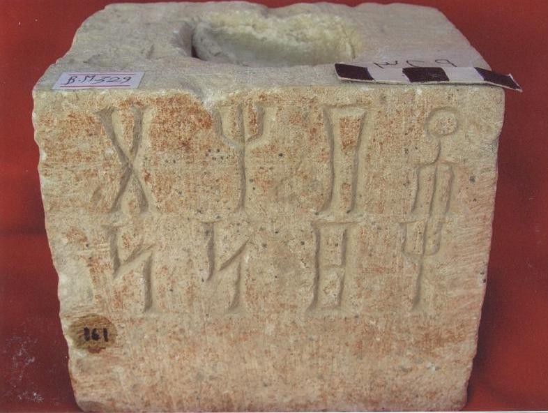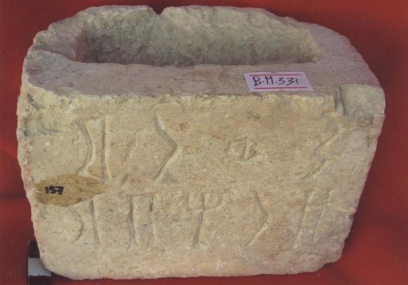قطعة من الحجر الجيري بيضاء اللون عبارة عن قاعدة لرأس ادمي مربعة الشكل ,على واجهتها الامامية نقش غائر بخط المسند مكون من سطرين نصها :...