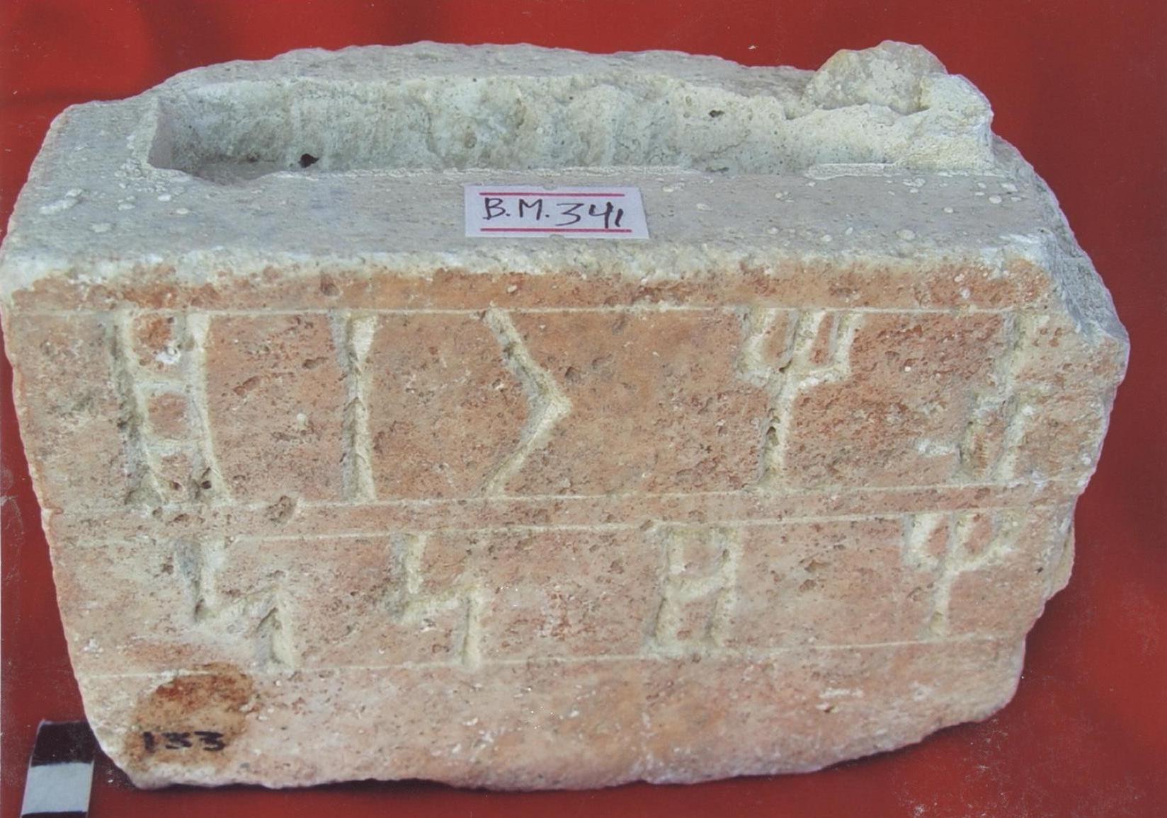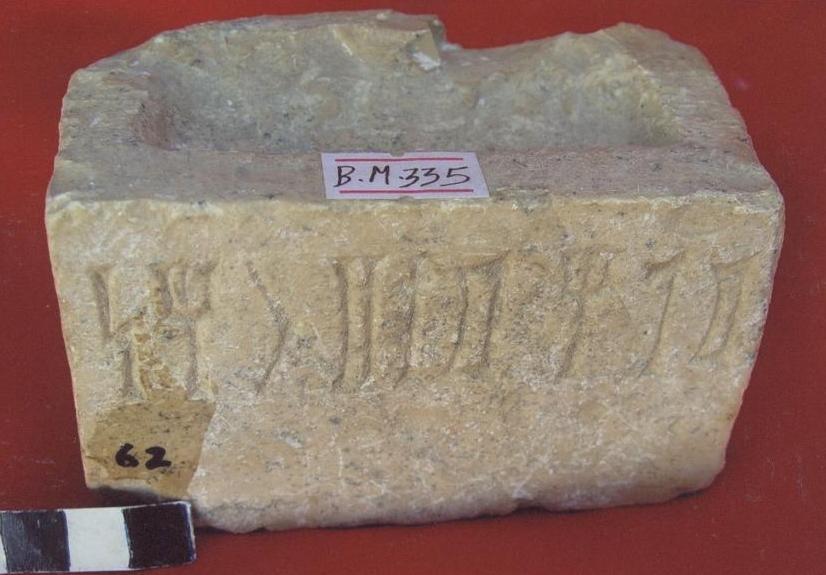 قطعة من حجر جيري عبارة عن قاعدة ذات اربعة اوجه ,الجوانب والامام مصقولة ومستوية على الواجهة سطرين بالخط المسند نصها :,