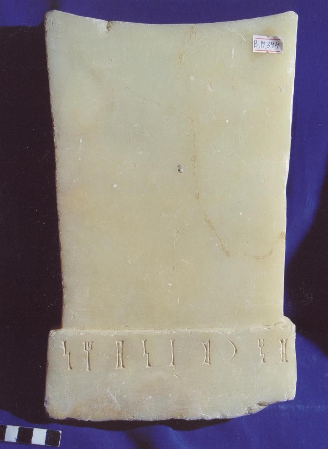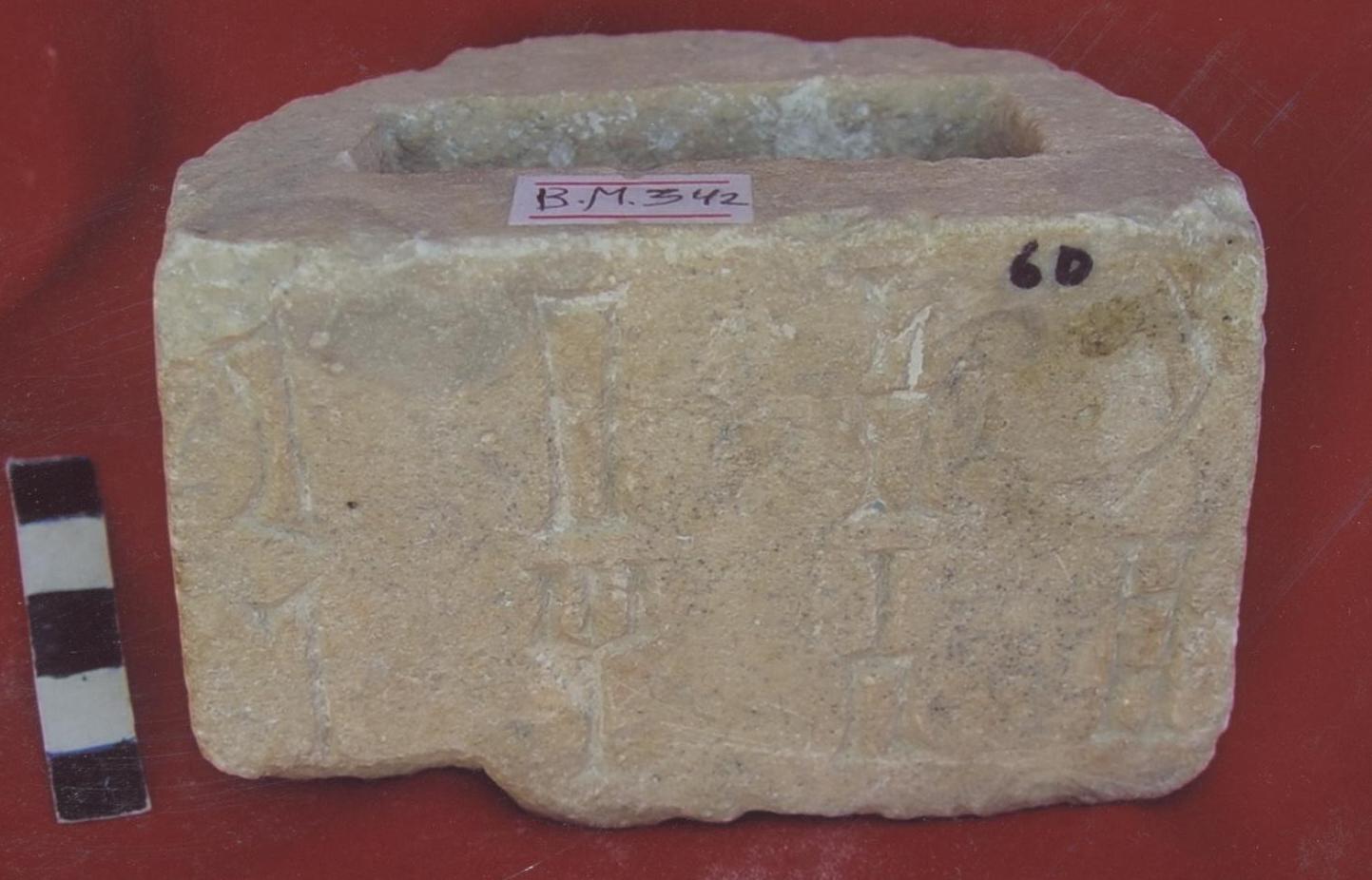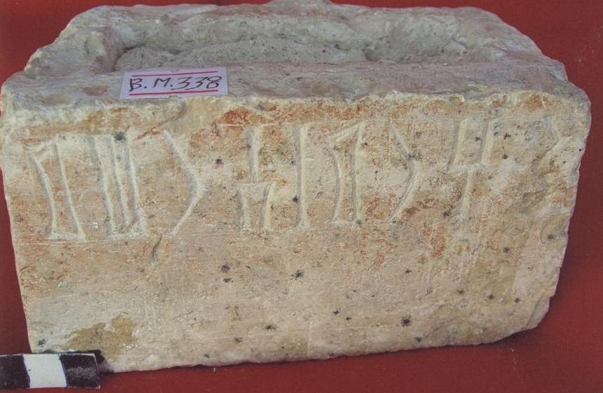 قطعة من الحجر الجيري عبارة عن قاعدة مدرجة مصقولة من جميع الجوانب على الواجهة سطرين بالمسند نصه :..