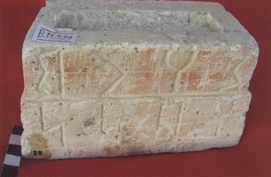 اسفل الكتابة حفرة غائرة مربعه , و بسطح القطعة حفر غائر