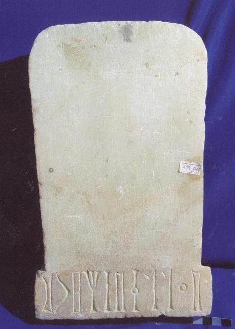 قطعة من الرخام بيضاء اللون عبارة عن شاهد قبر واجهتها الامامية مصقولة اسفله نقش غائر بالمسند مكون من سطر نصه :