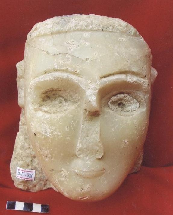 قطعة من الرخام بيضاء اللون عبارة عن وجه ادمي مكسور من اسفل الدقن مفقود معالم الوجه واضحة عملت بشكل متقن ,العيون لوزية مفرغة مفقودة مادة التطعيم ,الحواجب مثلث بخط محزوز الانف مكسور ومفقود ,مثلث الشفاة بخط مطبق الاذان بارزة ممتلئة ومثقوبة من الاسفل على الاذن اليمنى ثلاث ثقوب ,اما اليسرى ثقب واحد فقط ,اعلى الرأس بروز على الجبهة شرخ بسيط الشعر ينسدل الى الخلف