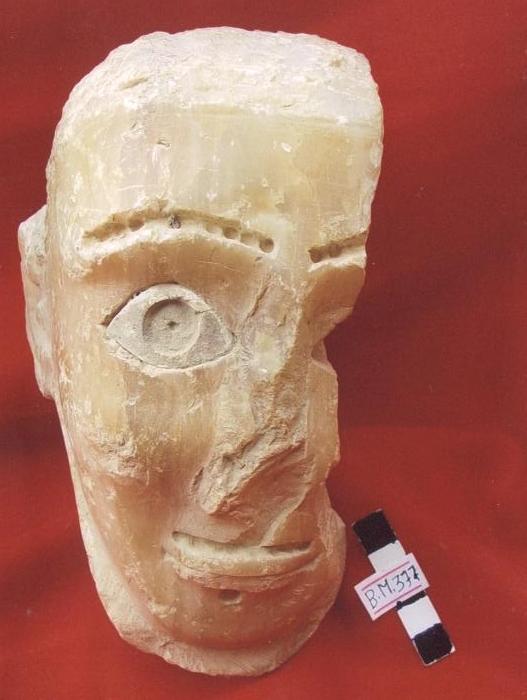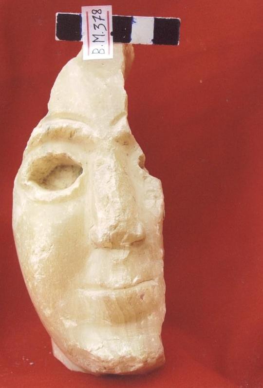 قطعة من الحجر الرخام قمحية اللون عبارة عن وجه ادمي مكسور الجزء الايسر منه ومفقود ملامح الوجه واضحة ومتقنة ,العين لوزية ععليها مادة التطعيم الحاجب ممثل بخط غائر ,الانف مشطوفه ومفقودة ,الفم مثل بالشفاة المطبقة بخط بارز اسفله ثقب الاذن ممثله ومتقنة الذقن مثلث ببروز دائري اعلى الراس مشذب خلفيتها غير مستويه