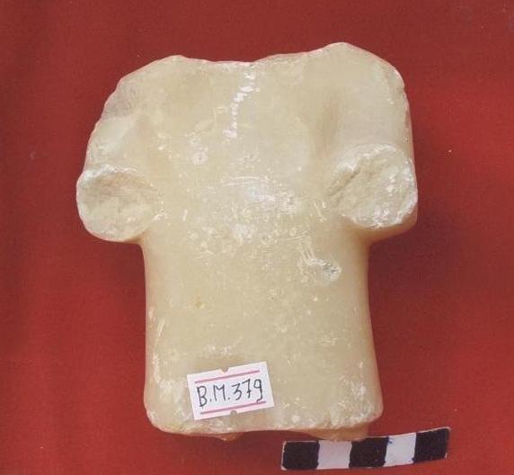 قطعة من حجر الرخام بيضاء اللون عبارة عن بدن ادمي الراس والارجل والايدي من الساعد مكسور ومفقودة الايدي من العضد ,محاذية وممدودة الى الامام ,خلفية البدن بارزة