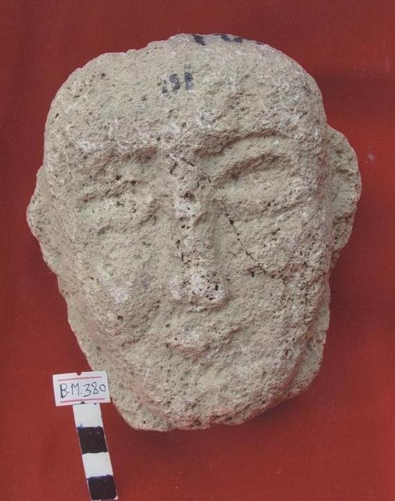 قطعة من الحجر الجيري رمادية اللون عبارة عن وجة ادمي ملامحة شبة واضحة العيون لوزية ,الحواجب مثلت بخط بارز ,الانف بارز ومشطوف من الامام ,الفم مثل بالشفاه المطبقة والاذان بارزة الاذن اليمنى مشطوفة الذقن مثل ببروز دائرية اسفله مكسور ومفقود ,القطعة أثرت عليها عوامل التعرية عليها شرخ من اعلى الانف حتى وسط الخد الايسر وعليها شطوف ,خلفيتها غير مهذبة