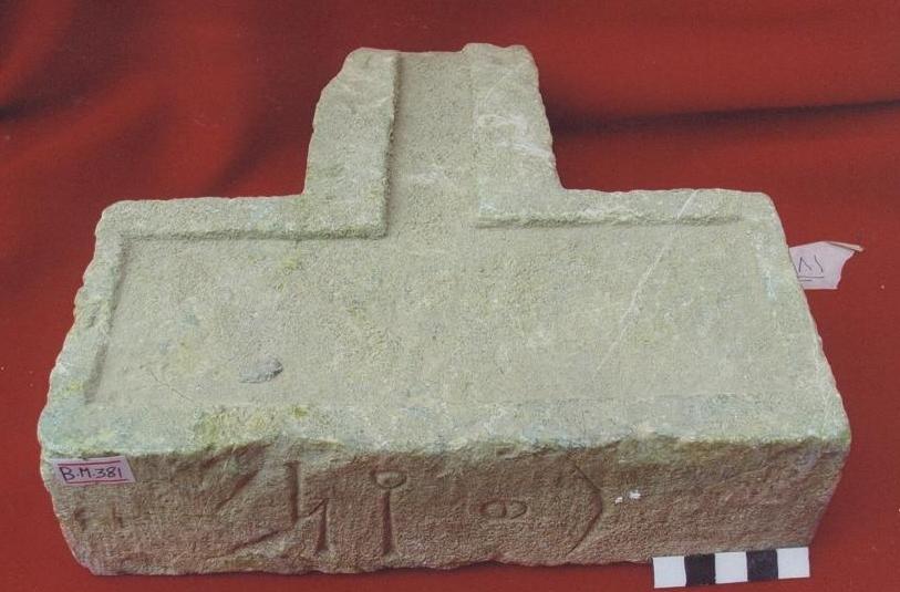 قطعة من الحجر الجيري عبارة عن مذبح صغير بدنة مستطيل الشكل له برواز مسطح وله مقدمة في اعلاه قناة ,المؤخرة عليها سطر بخط المسند نصها :..